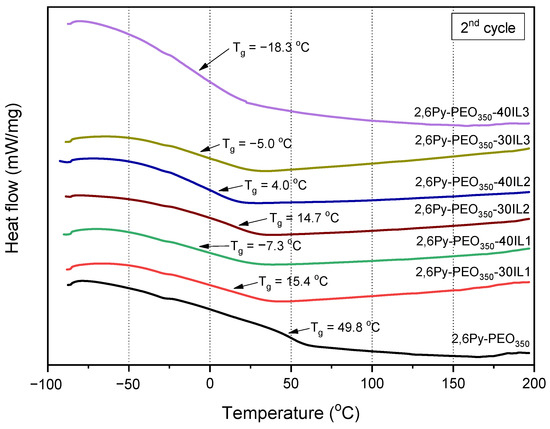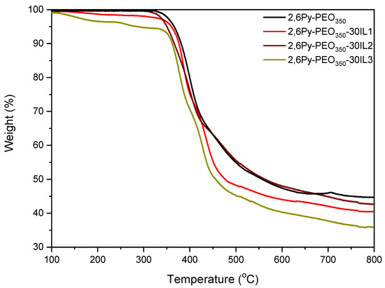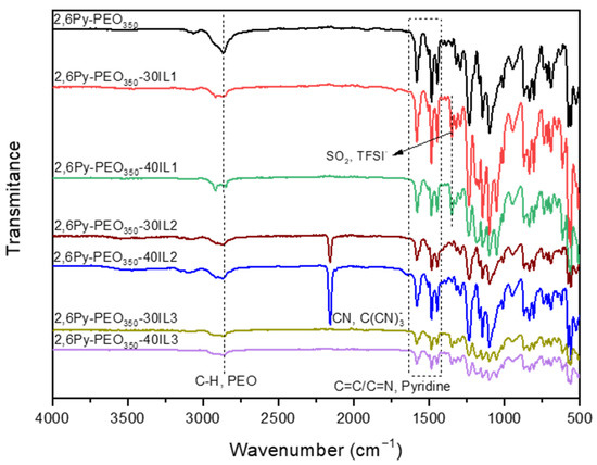 As illustrated in Figure 2, the precursor copolymer 2,6Py-PEO350 membrane along with the polymer-IL composite membranes were studied by ATR-FTIR spectroscopy. Regarding the precursor spectrum, the peak signal at 2868 cm−1 is assigned to methylene group vibrations of the PEO units [8,34]. In addition, the doublet peak at 1487 and 1471 cm−1 and the peak signal at 1583 cm−1 correspond to the C=C/C=N vibrations of the pyridine ring [8,35]. Considering that all ILs used in this work for the preparation of polymer-IL composite membranes contain a common imidazolium cation, the characteristic peak at 1574 cm−1 assigned to the imidazolium ring in plane symmetric/asymmetric stretch and –CH2(N)/-CH3(N)CN could not be observed in all composite membrane spectra due to overlapping with the peak at 1583 cm−1. However, after the addition of ILs containing a TFSI- anion, a new peak at 1350 cm−1 appears that can be attributed to the asymmetric stretching of the SO2 group [9]. The symmetric bending vibrations of the same group are located at 616 cm−1 and 604 cm−1. The peak located at 1053 cm−1 is assigned to the asymmetric stretching band of the S–N–S group, and its bending vibrations can be identified as very weak peaks at 650 cm−1 and 612 cm−1. The bands at 789 cm−1 and 509 cm−1 are also attributed to asymmetric bending of the CF3 group and the C-S bond of the TFSI- anion, respectively. After addition of IL containing a C(CN)3- anion, a new strong peak arose at 2158 cm−1, attributed to the stretching vibration of the -CN group [9,36]. No shifts were observed in the ATR-IR spectra of 2,6Py-PEO350-IL membranes compared to those of neat 2,6Py-PEO350 copolymers.