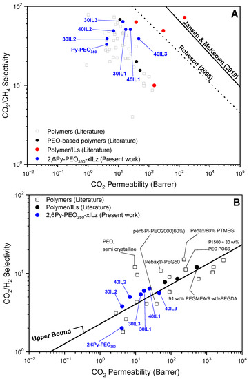 PEO-based copolymer/IL membranes have been investigated as CO2-selective membranes, and the effect of PEO-based copolymer and IL nature, as well as IL loading, on gas permeation properties has also been studied. In specific, Bernardo et al. [20] prepared composite membranes by entrapping different amounts of [BMIM][CF3SO3] into two different, Pebax®1657 and Pebax®2533, matrices. In the less permeable Pebax®1657, the addition of IL resulted in a gas permeability increase and a slight ideal selectivity decrease for most gas pairs. However, for Pebax®2533, the gas permeation properties were not particularly affected by the presence of IL, suggesting that the polymer matrix plays a major role in gas permeation.
