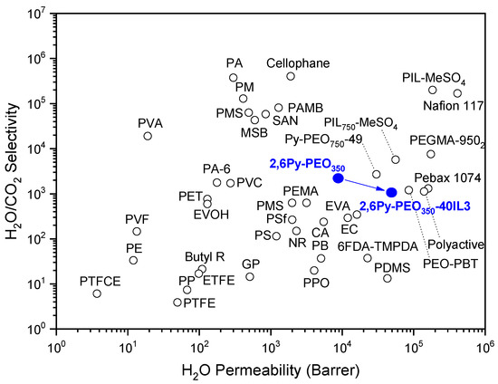 Comparison of H2O permeability with H2O/CO2 selectivity of 2,6Py-PEO350 and 2,6Py-PEO350-40IL3 membranes (blue circles) with other polymers reported in the literature (25–35 °C) [33].