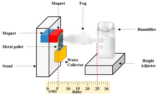 Figure 2 shows a schematic of the configuration employed in the fog collection experiment. A humidifier (V-31, SIXTHGU, Shenzhen, China) with a flow rate of 230 m3·h−1 was fixed 20 cm from the surface of the membrane. Samples of #S0, #S1, #S2, #S3, #S4, and #S5 with an area of 30.25 cm2 (5.5 cm × 5.5 cm) were wrapped onto the iron plate. The iron plate was then connected to the magnets on the stand. The container was positioned below the membrane to collect the water produced from the fog. The fog was collected over a period of 1 h at intervals of 6 min. The relative humidity was kept at 15%, and the temperature was held at 25 °C.