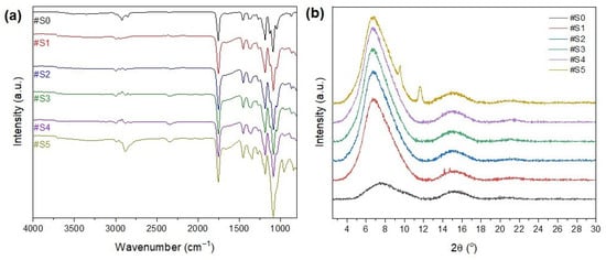 (a) FT-IR spectra and (b) XRD patterns of #S0, #1S, #2S, #3S, #S4, and #S5.