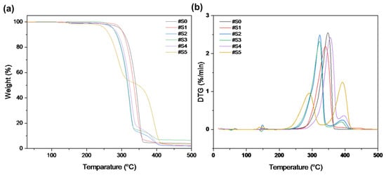 (a) TGA and (b) DTG curves of #S0, #1S, #2S, #3S, #S4, and #S5.