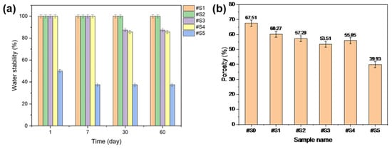 The water stability of the fabricated membranes was tested, and the results are shown in Figure 7a. #S1 and #S2 were highly stable in the presence of water. #S3 and #S4 showed sustained stability for up to 7 d; however, when the test was run for over 30 d, the stability of these samples dropped to ~80%. #S5 initially showed a stability of ~50%, but this value gradually decreased to ~40% over time.