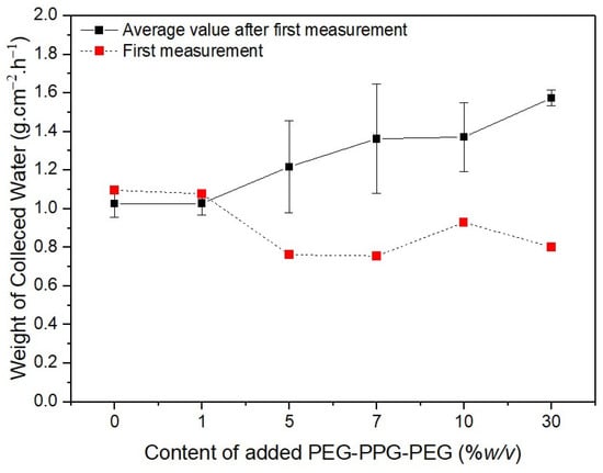 The black solid line in Figure 9 shows the results of five additional measurements taken after the first collection was completed. The amount of water collected in the second cycle of collection differed from that in the first cycle of collection because the second test was performed just before the membranes were dried. In this case, the quantity of collected water tended to increase as the PEG-PPG-PEG content increased. The difference in collected amounts was obvious in samples #S2, #S3, and #S4 because of the rate at which the hydrophobic portion of the membranes was cleared of the water vapor that had been absorbed by the fibers in their wet state. The rate of volume increase of the coalesced water droplets increased with the amount of water vapor still present in the pores, leading to a higher collection rate. Because the rate of absorption into the fibers was faster than that in #S2 or #S3, the amount of water absorbed progressively increased as the setting began. As a result, the difference in water collected decreased in #S4. The difference in fog collection quantity was the smallest for #S5. Because the pores of #S5 are smaller than those of the other samples, we believe that repeating the experiment will only have a small impact on the amount of water collected from this sample.