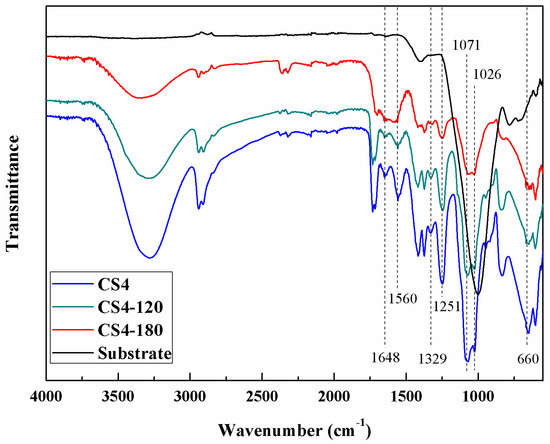 The chemical structure of the composite CS/PVA-based membranes was characterized by ATR-FTIR and compared with the primary glass fiber microporous membrane substrate as shown in Figure 2. The CS/PVA-based composite membranes exhibited characteristic peaks at 660 cm−1 which was attributed to the crystalline sensitive band of chitosan [33]. The peaks at 1648 cm−1 and 1329 cm−1 were assigned to amide I and III bands in the chitosan, respectively, and the peak at 1560 cm−1 could be attributed to an amide II band in the chitosan [34,35]. The characteristic peak near 1251 cm−1 was attributed to the in-plane vibration of a secondary hydroxyl group in the PVA and chitosan chains [36]. The characteristic peaks at 1071 cm−1 and 1026 cm−1 were attributed to the stretch of the secondary hydroxyl groups in the PVA and chitosan segments, and the primary hydroxyl groups in the chitosan segments, respectively. Compared with the characteristic peaks of the free secondary hydroxyl group (1100 cm−1) and primary hydroxyl group (1050 cm−1), these two peaks of hydroxyl groups were at a lower frequency, attributed to the hydrogen bond between the PVA and chitosan segments. The ATR-FTIR spectra indicated that the chemical structure and functional group of the polymer coating had no obvious change after a heat treatment under 180 °C.