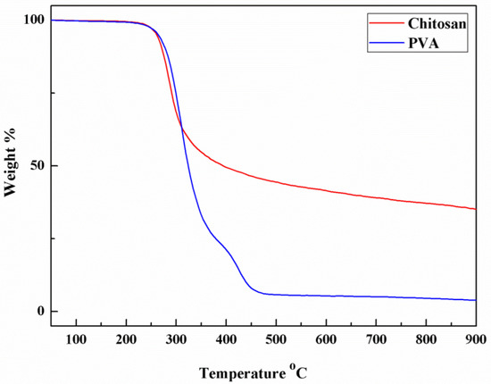 The weight loss curves of pure PVA and CS were determined by TGA as shown in Figure 3. Both the TGA curves showed a significant thermal stability under 230 °C. The two polymers both showed a major thermal loss step which indicated the decomposition of polymer main chains. The TGA indicated that the PVA and CS could withstand the heat treatment under 180 °C without significant decomposition.