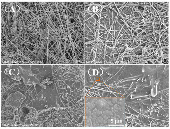 The surface morphology of the membranes. (A) glass fiber microporous membrane, (B) CS0, (C) CS4, and (D) CS6.