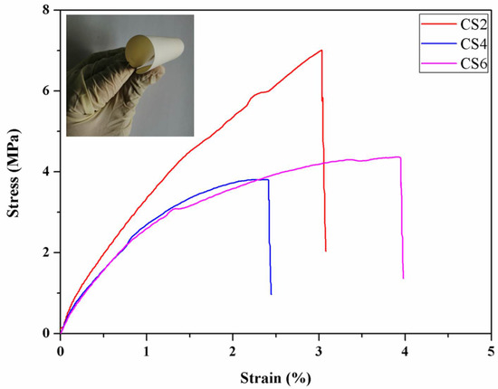 Strain-stress curves of the CS/PVA composite membranes are shown in Figure 5. For the composite membranes, the tensile strength was higher than 3 MPa. The CS/PVA coating rendered the originally brittle glass fiber membrane with a good flexibility as shown in the inset of Figure 5. The strain-stress curves suggested that the CS/PVA composite membranes were strong enough for the gas separation process.