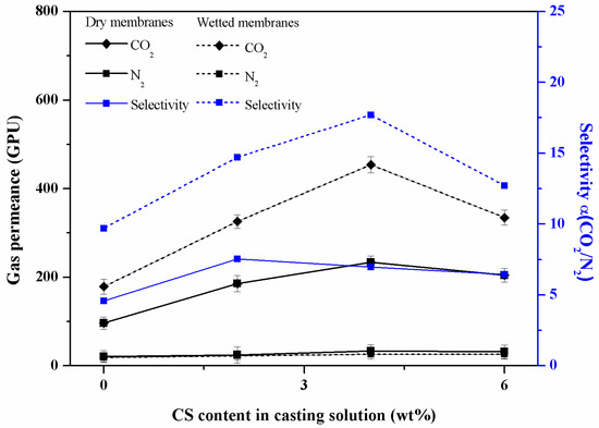 To improve the separation performance, the composite membrane CS4 was suspended above an 80 °C water bath to make it moist. In the wetted membrane, the CO2 transport was improved compared to that in the dry membrane, while the N2 permeance decreased slightly compared to that in the dry membrane, resulting in a significant improvement of the CO2/N2 selectivity in wet environments. This result could be attributed to the increasing moisture content in the CS/PVA coating of the composite membrane, so that the CO2 could reversibly react with water to produce bicarbonate, facilitating the transport of CO2 in the membrane. Compared with N2, CO2 permeance increases significantly since its affinity with carrier groups is higher [37,38], making CO2/N2 more selective in a wetted membrane than in a dry membrane. Here, in the wetted membranes, the CO2 permeance increased with the CS content and reached a maximum 454 GPU at a 4 wt% addition of CS, while the highest selectivity of CO2/N2 reached 17.71 and largely exceeded that of the dry composite membranes. The selectivity initially increased with the CS content, reached a maximum at 4 wt%, and then decreased with a further increase in CS.