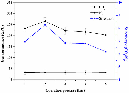 The composite membrane CS4 had the best overall gas performance selectivity. This composite membrane was further tested under a different pressure difference as shown in Figure 7. It could be observed that the N2 permeance of the composite membrane did not change appreciably at an operation pressure higher than a 2 bar level, while the CO2 permeance and CO2/N2 selectivity decreased slightly with an increasing operation pressure, which may have been caused by the promotion of transmission mechanisms [37,39]. This phenomenon occurred in the separation process of the membrane based on the solution-diffusion model. The calculation of the permeance requires a division of the pressure difference between the feed side and permeate side. Under a small pressure difference, the effect of promoting the transmission mechanism is significant, and the CO2 carriers gradually reach saturation when the pressure difference increases. At this point, CO2 flux will gradually tend to stabilize the constant at a high pressure difference [39]. For the above reasons, the CO2 permeance and the pressure difference here showed a negative correlation as a whole. The highest CO2 permeance and CO2/N2 selectivity of the composite membrane CS4 reached 265 GPU and 8.27 at the 2 bar level.
