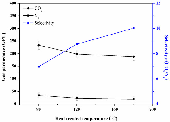 As shown in Figure 8, the heat-treated composite membrane CS4 at 120 °C and 180 °C showed an improved separation performance. The heat treatment would cause certain physical crosslinking by the rearrangement of polymer crystallites in the CS/PVA coating [22]. Consequently, the CO2 permeance of these heat-treated composite membranes decreased to 198 GPU and 187 GPU while the CO2/N2 selectivity increased, but then again, the chemical structure and functional group of the polymer coating had no obvious change after the heat treatment, as shown in Figure 2. Due to the presence of a large number of amino groups and hydroxyl groups in the CS/PVA composite coating, the heat-treated composite membrane showed a high CO2 permeance and selectivity for CO2/N2 while maintaining a good mechanical property [22]. On the other hand, the hydrogen bonds between the PVA and chitosan segments indicated by the results of the ATR-FTIR also maintained a high CO2/N2 selectivity.