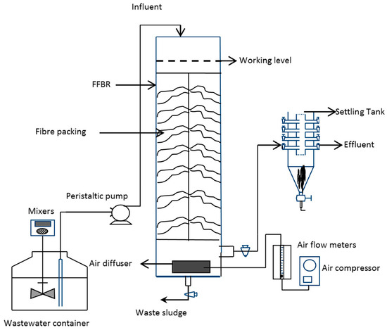 Compared to suspended growth reactors, the employment of biofilm reactors in wastewater treatment renders better biological treatment performance via high biomass concentrations and much more resistance to organic shock loads [2]. Moreover, there are no challenges related to sludge handling and bulking phenomenon common in the case of many suspended growth systems [2]. Overall, numerous configurations of the biofilm reactors have been used to treat municipal and industrial wastewaters. However, the majority of studies are focused on moving bed bioreactors (MBBRs) [3], integrated fixed-film activated sludge (IFAS) processes [4], membrane biofilm reactors (MBfRs) [5], and rotating biological contactors (RBC) [6]. The biofilm reactors, despite their abundant usefulness, may be undesirable in biological treatment operation and arise operational difficulties that increase the treatment costs [1,7]. The use of flexible fibre media in the biofilm reactors, called flexible fibre biofilm reactor (FFBR), can reduce the operational expenses via the low cost of packing media, elimination of recycling sludge stream as a result of low washout rate, and provision of very high specific surface area (~2200 m2/m3) [7]. Additionally, installation of flexible fibre bundles inside the reactor is easy and also pressure loss is negligible in these reactors [7]. Compared to other biofilm reactors, blocking problems are avoided in the FFBR due to the flexibility of packing media and movements induced by air and water flows [8]. Therefore, these prominent advantages have encouraged the researchers to develop the FFBR in different configurations to treat high strength wastewaters. In this sense, Yu et al. developed FFBR into a two-stage flexible fibre biofilm reactor to treat food processing wastewater [9]. Total chemical oxygen demand (COD) removal efficiency was 97% at CODin of 2700 mg/L with an organic loading rate (OLR) of 7.7 kg/m3d. With the inspiration from this work, we designed an innovative sequencing batch flexible fibre biofilm reactor (SB-FFBR), flexible fibre biofilm bioreactor, and multistage flexible fibre biofilm reactor to remediate raw milk processing wastewater [10,11,12,13]. The COD and TSS removal efficiencies were reported to be 92.5% and 89.1%, respectively, showing the high performance of the biofilm reactor. In another study, we obtained high COD removal efficiency of 97% at 1.6 d hydraulic retention time (HRT) and 2.74 kgCOD/m3d OLR using the same reactor and wastewater at different operational conditions [14]. Zinatizadeh et al. investigated the performance of a moving bed biofilm reactor (MBBR) treating municipal wastewater under various operating conditions as HRT (4–12 h) and DO concentration (2–4 mg/L) [3]. The maximum COD removal efficiency of 88% was obtained at HRT of 12 h and AFR of 4 mg/L using Kaldnes-3 as packing media. Mirghorayshi et al. studied the bioprocess functionality of a novel hybrid airlift bioreactor (HALBR) treating composting leachate at various HRTs, AFRs, and AVRs of 18–30 h, 1–2 L/min and 0.22–0.26, respectively [15]. The COD removal efficiency of 90% was reported at optimum region i.e., HRT of 28.3–30 h and AFR of 1.7–2 L/min.