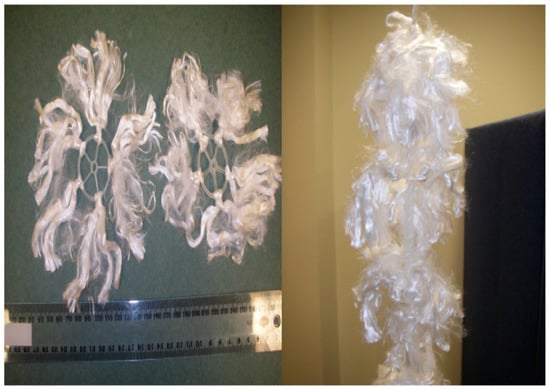 A lab-scale single stage flexible fibre biofilm reactor (SS-FFBR) was fabricated and set up at the microbiology science laboratory, Griffith School of Engineering, Griffith University, Australia. The reactor set-up is depicted schematically in Figure 1. A square-shaped reactor with an effective capacity of 8 L and dimensions of 650 × 125 mm (height × width) was made of transparent sheets of acrylic plastic with 6 mm thickness. The wastewater was introduced from the top of reactor using a peristaltic pump (Cole Parmer, Vernon Hills, IL, USA, Masterflex, Model 7523-60) and the treated effluent was discharged from the reactor base. The reactor was followed by a sedimentation tank with a 12.5 L volume and various HRTs. Seven flexible fibre bundles as packing media were circularly fixed in the centre of the reactor with the aid of a rope. The flexible fibres were attached to the rope at intervals of approximately 80 mm. The specifications and arrangement of the packing media inside the reactor are presented in Table 2 and Figure 2, respectively. The highlighted feature of the flexible fibres is their large surface area which provides a large space for growth and attachment of the microorganisms. The reactor was aerated and mixed using two air diffusers fixed at the base of the reactor.