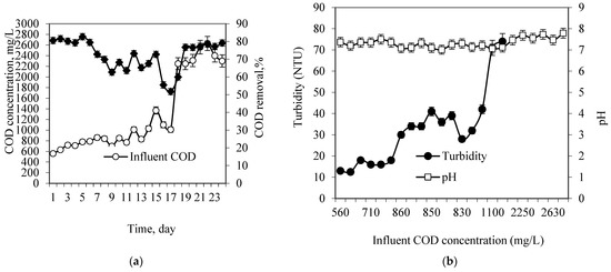 During the start-up phase, the turbidity and pH of the reactor effluent were monitored regularly. It has been established that pH is an important parameter influencing the performance of biological processes [17]. Figure 3b demonstrates the pH variations and effluent turbidity during the start-up period. The pH remained at almost neutral, in the range of 7–7.4, in the first 20 days of the start-up period. However, a significant increase in the pH value over 7.5 was observed when the influent COD concentration increased and reached a value over 2250 mg/L. However, this range of pH is still in the appropriate range for the biological process.