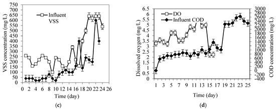 The influent and effluent VSS concentration variations during the start-up period are shown in Figure 3c. It can be seen that the effluent VSS concentration increased gradually with operational time as influent VSS concentration increased. In the first 7 days of the acclimatization, the effluent VSS concentration was low as the biofilm was in the developmental stage. The influent solid concentration applied to the reactor was also low. However, the effluent VSS concentration showed a gradual increase even when there was fluctuation on the influent VSS concentration in the second week. On day 17, the effluent VSS concentration increased significantly even when the influent VSS decreased. This could be due to the detachment of biofilm from the media, or increased growth of suspended growth microorganisms. From day 19 to day 23, the influent VSS was increased and kept constant, and in this period, the effluent VSS concentration was dropped and fluctuated, which may be attributed to increases in the sloughing rate as well as the rate of hydrolysis.