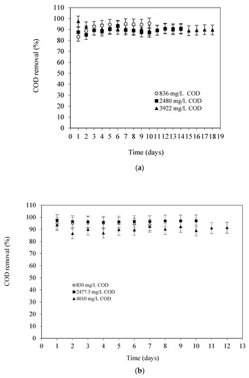 The performance of the SS-FFBR for COD removal efficiency was influenced by the influent COD concentration of the wastewater. Figure 4a presents the COD removal efficiencies at 8 h HRT for various COD concentrations. The response was measured three times, and average value was reported. It can be observed that the COD removal efficiencies decreased with increases in the influent COD concentration of the wastewater. At the stable condition, the achieved COD removal efficiencies were 95.5%, 90.3%, and 89.9% when the reactor was operated with an average influent COD concentration of 836 mg/L, 2480 mg/L, and 3922 mg/L, respectively. There was 9.1% of COD not removed and this is considered as the non-biodegradable portion of the waste organic. It is evident from the results that the SS-FFBR reactor showed consistently good performance at higher influent COD concentrations and was stabilized relatively quickly. This was mainly due to the increased biomass concentration in the reactor, which was nearly 3465 mg VSS/L in the form of suspended biomass. Akhbari et al. acquired the highest COD removal of 93.55% at HRT of 18.7 h using an integrated system (RBC-AS), rotating biological contactor (RBC), and activated sludge (AS) in treating synthetic wastewater [18].