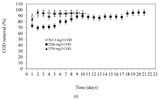 COD removal efficiency of SS-FFBR at various HRTs of (a) 8 h; (b) 12; (c) 16.