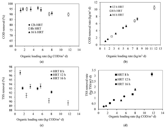 Figure 6b shows the influence of the solids loading rate on the TSS removal rate at different HRTs. The SLR has a similar effect on the process responses to the OLR. It can be noted from this Figure that the TSS removal rate increases with increases in the SLR, and there is a strong correlation between these two factors at various HRTs. The TSS removal rate has a linear relationship with SLR. TSS removal rates were1.15, 1.78, and 3 kg TSS/m3d at SLRs of 1.23, 2.24, and 3.32 kg TSS/m3d and HRTs of 16, 12, and 8 h, respectively. It can be deduced that reactor productivity in terms of TSS removal rate was high as well.