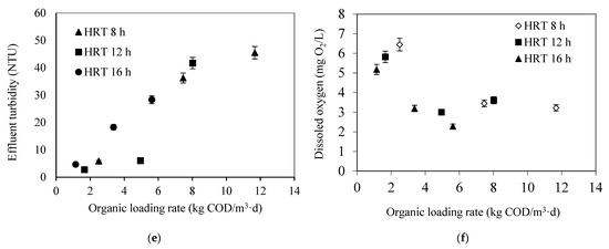 Effect of organic loading rate on (a) COD removal efficiency, (b) COD removal rate, (c) TSS removal efficiency, (d) TSS removal rate, (e) effluent turbidity, (f) DO concentration at different HRTs.