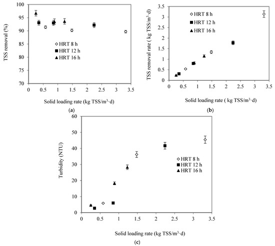 Effect of SLR on (a) TSS removal efficiency, (b) TSS removal rate, (c) effluent turbidity at different HRTs.