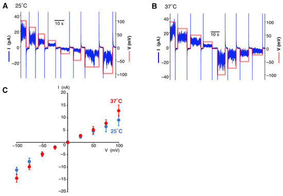 We selected KCNK2 (TREK and TREK-1), a well-studied K2P channel, as our sample. It is known to open with changes in voltage and temperature [33,34]. After adding the cell-free synthesized KCNK2 proteoliposomes to the chamber of the PLB device and incubating them with a voltage applied, the current signals were observed. The conductance of the KCNK2 channel at 25 °C and 37 °C was measured by varying the voltage from 100 mV to −100 mV, respectively (Figure 2A,B). Under both temperature conditions, the frequency and current amplitude of the pulses changed with voltage. The I-V plots clearly showed the voltage dependency of KCNK2 (Figure 2C). When the temperature was increased from 25 °C to 37 °C, the average channel conductance increased from 93.1 pS to 112.4 pS. The conductance at 25 °C is consistent with the previously reported results of a mouse TREK-1a channel obtained using a single-cell patch clump [35].