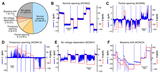 PLB assay of 47 cell-free synthesized voltage-gated K+ channels. (A) Summary of PLB assay. Representative current signals of normal opening (B), partial pore opening (C), temporary pore opening (D), no voltage-dependent opening (E), and baseline drift (F) are shown.