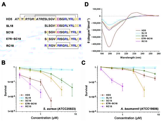 - Wang, C.; Zhao, G.; Wang, S.; Chen, Y.; Gong, Y.; Chen, S.; Xu, Y.; Hu, M.; Wang, X.; Zeng, H.; et al. A simplified derivative of human defensin 5 with potent and efficient activity against multidrug-resistant Acinetobacter baumannii. Antimicrob. Agents Chemother. 2018, 62, e01504–e15017. [Google Scholar] [CrossRef]