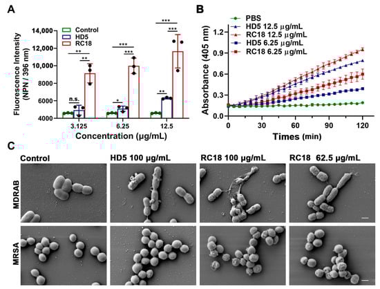 3.3. Bacterial Membrane Disruption Induced by RC18