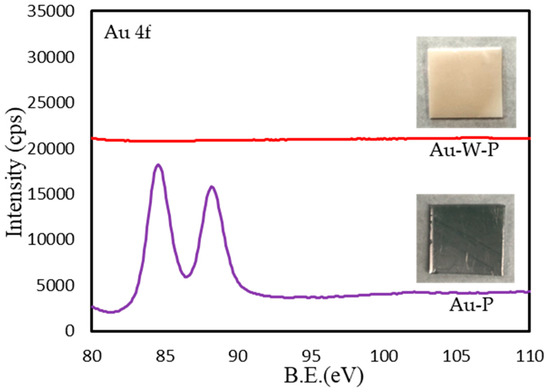 Figure 2 shows the photographs and XPS (Au4f) results of the Au-sputtered samples before and after washing with aqua regia solutions. After Au sputtering, a metal layer was observed in the Au-P samples. The Au 4f spectra in the XPS results show that the sputtering layer was Au metal. After washing with the aqua regia solution, the Au layer was completely removed, as indicated in Figure 2 (Au-W-P).