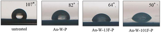 Wettability, which was measured using contact angle measurements, is an important factor for polymer membranes. The water contact angle of the untreated PTFE sample was 107°, as shown in Figure 4, whereas those of the surface-modified PTFE samples were lower owing to the increased surface roughness (Figure 3). However, the water contact angle of Au-W-101F-P sample (50°) was lower than that of Au-W-13F-P, despite its lower surface roughness. The roughness of the PTFE surface increased after Au sputtering and surface fluorination. Some hydrophilic groups were also generated on the PTFE surface, which increased the polarity and surface energy; thus, the hydrophilicity of the PTFE surface improved significantly. This may be attributed mainly to the defluorination of hydrophobic groups, such as –CF2 on PTFE, due to the gold sputtering and acid washing process.