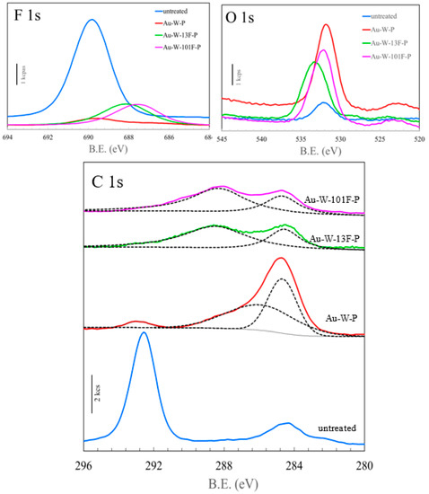 The FTIR spectra of the untreated and modified PTFE samples are shown on Figure 6. The spectrum of the untreated PTFE sample exhibited absorption bands at 1203 and 1147 cm−1 (corresponding to the –CF2 stretching vibration peak). The absorption bands of the other modified PTFE samples appeared to be the same as those of the untreated samples. To verify the effects of surface modification on the surface structure of PTFE, the vertical axis of the FT-IR spectra was enlarged, as shown on Figure 6 (bottom). The new peak at 1646 cm−1 corresponded to the C=C resonance vibrations in the cross-links of the Au-W-P samples. After the surface fluorination, the intensities of the absorption bands at 1726 cm−1 (C=O stretching vibration peak) and 1852 cm−1 (O–F stretching vibration peak) increased. Moreover, after the gold sputtering and washing process, a broad peak appeared in the range of 3500–3100 cm−1, corresponding to the OH stretching vibration peaks. This broad peak was intensified after the surface fluorination at high F2 pressure. With increasing surface fluorination, the signals indicated a surface rearrangement and a reaction with hydroxyl groups that were dissociated from the moisture in air, which bonded to the carbon radicals due to CF4 gasification. This strong hydrophilic bond led to a decrease in the contact angle with water, as shown in Figure 4.