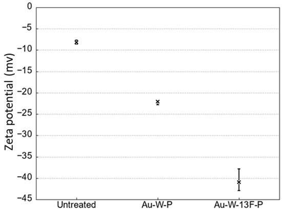 After surface fluorination, the fluorinated bonds (C–Fx or C–OF) as shown in XPS results increased on the PTFE surface. Additionally, these fluorinated bonds indicated high electronegativity from the results of zeta potential (Figure 7). The Zeta potential (−40.41 mV) of Au-W-13F-P samples was about 5 times negatively larger than that of untreated sample. This result is similar to the results in previous studies [35,36].