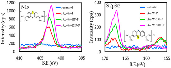 The exhaustion of the MB dye after surface staining of the PTFE samples was evaluated by XPS analysis (Figure 9). The chemical formula of MB is C16H18ClN3S, and the N and S contents of the adsorbed MB were determined from the N 1s and S 2p3/2 XPS spectra. In the untreated samples, N 1s and S 2p3/2 peaks were not detected. However, both N 1s and S 2p3/2 peaks were observed for the Au-W-P samples. Moreover, the intensities of the N 1s and S 2p3/2 peaks of the fluorinated samples were much higher than those of the Au-W-P samples. The intensities of N 1s and S 2p3/2 peaks increased with increasing F2 pressure in fluorinated samples. The intensities of the N 1s and S 2p3/2 peaks were proportional to the visibly observed degree of deep coloring (Figure 8). The dyeability of the fluorinated samples was attributed to their higher roughness and higher electronegativity (Figure 7). MB, being a salt with a cationic component, underwent an easy adsorption on the negative surface of the fluorinated PTFE samples via Coulomb attraction.
