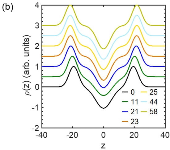 Electron density profile transverse a lipid membrane extracted from the fit against Equations (2)−(4) in Figure 2 for (a) the composition of DOPC/DSPC/Chol = 14/44/42 and (b) all the compositions for homogeneous membranes at 23 °C. marks the position of the headgroups, and is defined as the membrane thickness. Curves in (b) are vertically shifted for clarity.