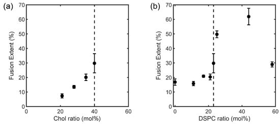 Fusion extent for the (a) laterally heterogeneous and (b) homogeneous membranes as a function of composition at 23 °C. The compositions are designated by their (a) Chol and (b) DSPC contents. Detailed compositions are given in Table 1. Dash lines mark the critical composition. The measurements were repeated at least triply with independently prepared samples.