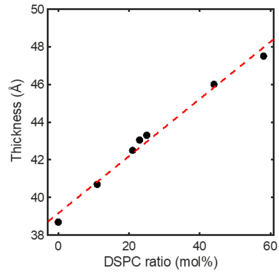 Membrane thickness determined with SAXS for the homogeneous membranes as a function of composition at 23 °C. The compositions are designated by their DSPC contents. Detailed compositions are given in Table 1. Dashed line is a linear fit to guide the eyes.