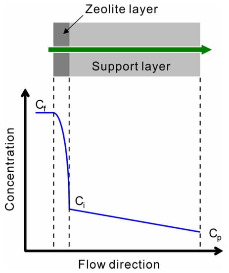 Schematic illustration of concentration gradient across the zeolite membrane supported by porous substrate. Cf is the concentration in the feed, Cp is the concentration in the permeate, and Ci is the concentration at the interface of the zeolite and support layers.
