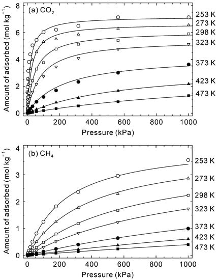 Simulated adsorption isotherms of (a) CO2 and (b) CH4 on CHA-type zeolite with Si/Al = 18.2 at 253–473 K. Symbols describe the simulated data, and lines are calculated values by Equation (13) and Table 2.