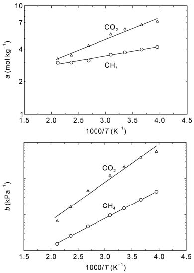 Figure 4 shows the effect of temperature on the adsorption amounts at saturation and Langmuir constants of CO2 and CH4. Both the saturated adsorption amounts, a, and Langmuir constants, b, decreased with increasing temperature. An Arrhenius dependence was observed, as is typical for adsorption isotherms, with the temperature dependencies described by: