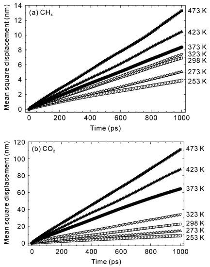 Time courses in the mean square displacements of (a) CH4 and (b) CO2 at 253–473 K.