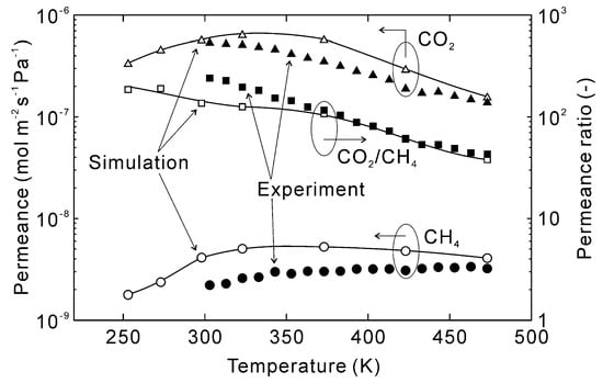 Figure 8 shows the effect of temperature on the estimated permeation properties of CO2 and CH4 for an equimolar mixture. The permeances of CO2 and CH4 at 253 K were 3.3 × 10−7 and 1.8 × 10−9 mol m−2 s−1 Pa−1, respectively, with a resultant CO2/CH4 permeance ratio of 190. The CO2 permeance increased with increasing temperature until reaching a maximum at 323 K and then decreasing with further rising temperatures. As a result, the CO2 permeance decreased to 1.5 × 10−7 mol m−2 s−1 Pa−1 at 473 K, with the permeance ratio also decreasing to 38. Notably, the simulated permeances followed similar trends as the experimental data and the permeances at 473 K were nearly identical. This convergence is because the effect of preferential adsorption was marginal at 473 K compared to lower temperatures, which suggests accurate prediction of permeation properties requires accurate estimates of adsorption amounts.