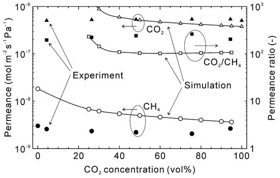 Figure 9 shows the influence of the CO2 concentration on the permeation properties of CO2 and CH4 at 303 K. The pure gas CO2 permeance was estimated to be 3.8 × 10−7 mol m−2 s−1 Pa−1 and slightly increased with decreasing CO2 concentration until around 40%. However, below 40% CO2 the CO2 permeance increased significantly. This was due to a relative change in the permeance versus partial pressure difference between feed and permeate streams. At 40% CO2, the partial pressures of CO2 on the feed and permeate sides were 120 kPa and 96 kPa, respectively, with a permeate flux of 1.5 × 10−2 mol m−2 s−1. At 30% CO2 concentration, the partial pressures and permeate flux were 90 kPa, 84 kPa, and 6.0 × 10−3 mol m−2 s−1, respectively. This means the relative permeate flux at 30% CO2 compared to 40% CO2 was 1/2.5, whereas the partial pressure difference was 1/4. As a result, the CO2 permeance increased below 40% CO2. For all conditions, the estimated CH4 permeance was higher than the experimental data, as discussed in Figure 7 and Figure 8, which is the cause of the lower CO2/CH4 permeance ratio.