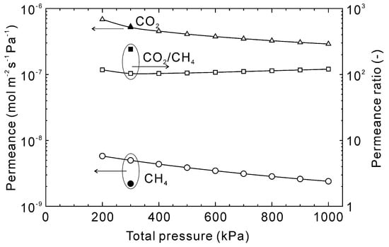 Figure 10 shows the influence of the total pressure on the permeation properties of CO2 and CH4 at 303 K. When the total pressure was 200 kPa, the estimated permeances of CO2 and CH4 were 6.8 × 10−7 and 5.8 × 10−9 mol m−2 s−1 Pa−1, respectively, with a CO2/CH4 permeance ratio of 120. The permeances decreased with increasing total pressure and at 1000 kPa were 2.9 × 10−7 for CO2 and 2.4 × 10−9 mol m−2 s−1 Pa−1 for CH4. The decrease was calculated to be similar for both gases so the permeance ratio was nearly independent of total pressure.