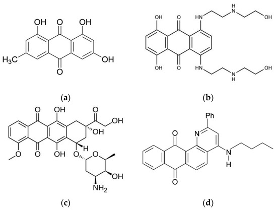 - Malik, M.S.; Alsantali, R.I.; Jassas, R.S.; Alsimaree, A.A.; Syed, R.; Alsharif, M.A.; Kalpana, K.; Morad, M.; Althagafi, I.I.; Ahmed, S.A. Journey of anthraquinones as anticancer agents—A systematic review of recent literature. RSC Adv. 2021, 11, 35806–35827. [Google Scholar] [CrossRef]