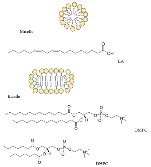 Schematic representation of the micelle and the bicelle and structures of linoleic acid (LA), DMPC (1,2-dimyristoyl-sn-glycero-3-phosphocholine), and DHPC (1,2-diheptanoyl-sn-glycero-3-phosphocholine).