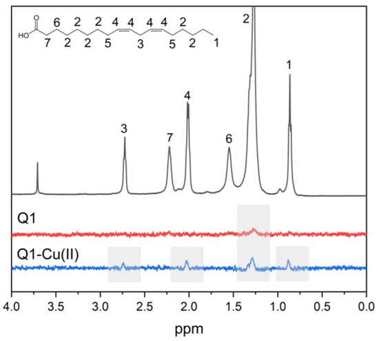 1D NOESY spectra of Q1 (red line) and the Q1−Cu(II) complex (blue line) and 1H NMR spectra (gray line) of Q1 in LA micelles. pH = 7.4. Q1 concentration was 1mM.