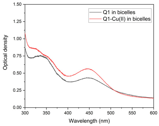 To make sure that the Q1−Cu(II) complex was present in this system, additional experiments were performed using optical spectroscopy. The absorption spectra of Q1 and the Q1−Cu(II) mixture in linoleic acid micelles are shown in Figure 4. When copper was added, changes in the spectrum characteristic of Q1−Cu(II) complexes were observed (changes of the optical density at 340 and 450 nm) [34]. The same result was obtained for the Q1−Cu(II) complex in bicelles.
