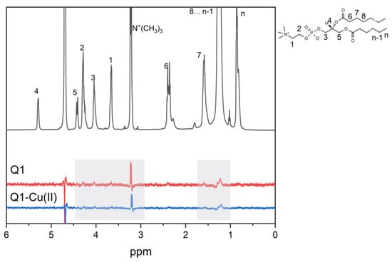 At the next stage, experiments were performed at the more relevant membrane model, DMPC/DHPC bicelles. Selective 1D NOESY spectra of Q1 and the Q1−Cu(II) complex in bicelles are shown in Figure 5. Due to the low solubility of Q1 at neutral pH, experiments were performed at pH = 4. DMPC/DHPC bicelles are stable at a pH range of 4−7 [55]. The cross-peaks of the signals of aromatic protons of Q1 with phospholipid signals of acyl (CH2) groups, N+(CH3)3 groups and 1, 2, and 3 protons (Figure 5) were observed. It means that same as in the case of LA micelles Q1 penetrated into the lipid bilayer. The absence of the cross-peak with the terminal CH3 group means that Q1 did not reach the middle of the bilayer and was located inside the hydrophobic part of the bilayer but near its surface. The same results were observed for Q1 and the Q1−Cu(II) complex.