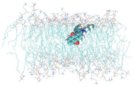 Interaction of drug molecules with lipid membranes and the exact knowledge of their binding site and distribution in lipid bilayers is of great importance for novel drug development. Many factors influence the interaction of drugs with the cell membrane, such as lipophilicity, size, solubility, and charge [43]. Lipophilicity and charge are key aspects of pharmacopoeia that determine their biological activity [43,44,45]. The measured relative lipophilicity (log P) of Q1 was 1.4 ± 0.1, and log P of the Q1−Cu(II) complex was 1.3 ± 0.1. It is comparable with log P values for doxorubicin (log P = 1.3 [46]), and emodin (log P = 1.74 [47]) and higher than the value for mitoxantrone (log P = 0.79 [48]). Therefore, all mentioned anthraquinones were quite lipophilic, but lipophilicity is not the single factor affecting membrane permeability. Therefore, for another chelator, thiosemicarbazone Dp44mT which is even more lipophilic than anthraquinones (log P = 2.19 [49,50]), it was shown that it cannot penetrate deeply into the lipid bilayer, remaining bound to the surface and staying outside the bilayer for a significant part of the time [47]. For anthraquinone emodin, it was shown that it is bonded to the surface of the lipid bilayer and oriented parallel to it [47,51].
