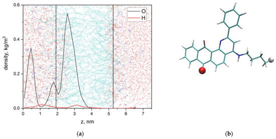 These experimental results were confirmed by MD simulations. Figure 6 illustrates the localization of Q1 in the membrane. Q1 molecule quickly (~6 ns) penetrated into the lipid bilayer. Figure 7a shows the calculated density profiles of the selected H and O atoms (see Figure 7b) across the box. The lipid bilayer was centered at the center of the box.